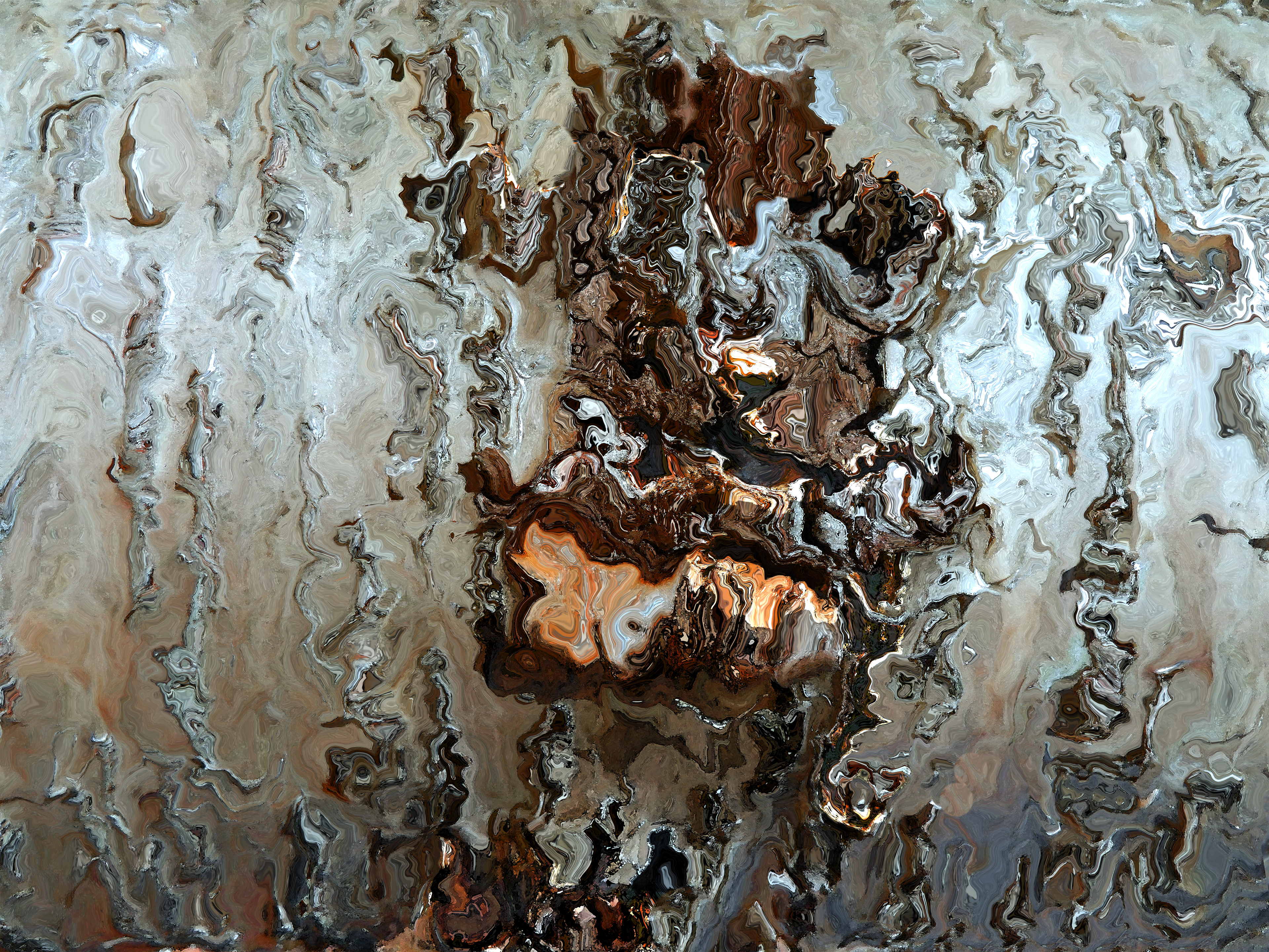 Digital photography and digital manipulation can reveal details the human eye is unable to perceive. The depth of this hidden detail is tremendous and always surprising, being composed of more color, more line and more shape, seemingly unrelated to the subject. The dots, lines and shapes in this image originated in an image of a slowly flowing brook.