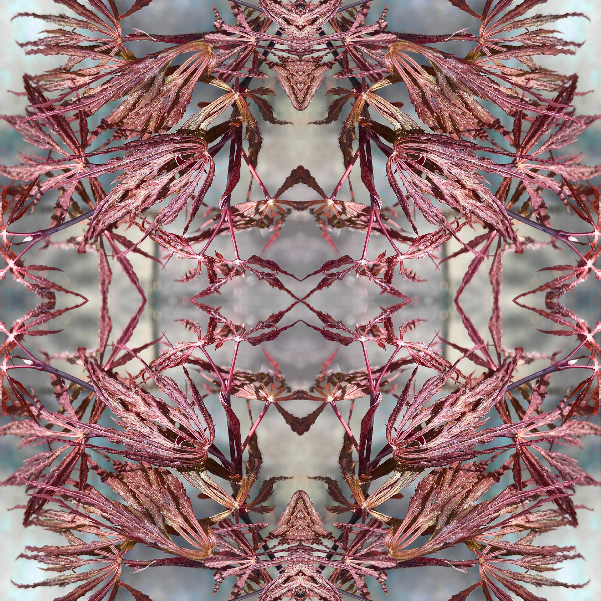 THE NIPON COLLECTION... features highly stylized arrangements of Japanese red maple leaves. A kaleidoscopic effect set off by an out of focus, neutral, mottled background.